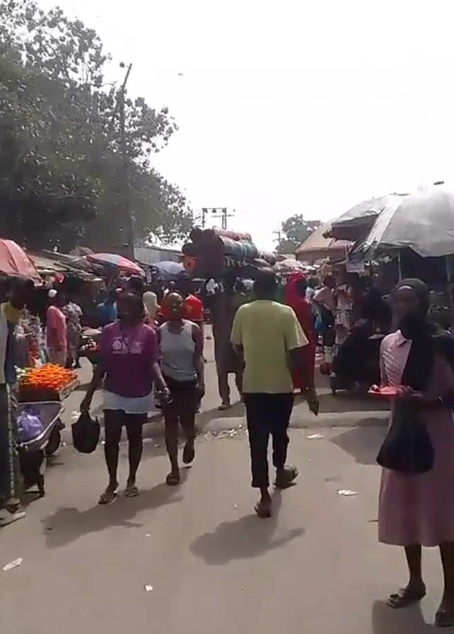 The video depicts a bustling outdoor market scene