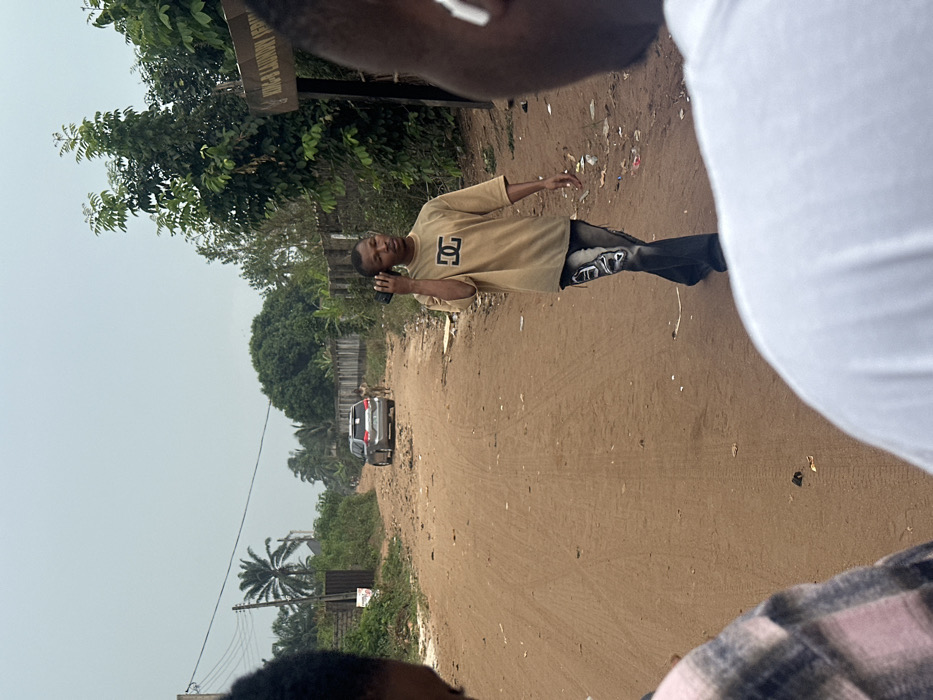The image presents an outdoor scene on an unpaved, reddish-brown dirt road in Orie Uratta, Nigeria, under a light grey, overcast sky