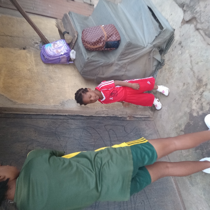 This image depicts an outdoor scene in Umuode, Nigeria, featuring two individuals and various objects against a building facade. In the left foreground, an individual with dark skin stands with their back to the camera, wearing a dark green athletic t-shirt with yellow side stripes, dark green athletic shorts with yellow side stripes, and white sneakers. To their right, in the mid-ground, a young child with dark braided hair wears a red short-sleeved athletic top with white shoulder and side stripes, red shorts with white side stripes, and white sneakers; the child looks downwards and slightly to their left. The background consists of a light brown, textured wall. To the left, behind the first individual, is a dark, possibly wooden door exhibiting etched markings. To the right of the child, a multi-tiered structure, possibly a set of steps or a bench, is covered with a dull green tarp-like material. Resting on this covered structure are a purple backpack with a character graphic, a small natural fiber broom on a narrow wooden plank, a small light-colored stone, and a brown checkered backpack with black elements. A dark, diagonal beam or pipe extends upwards from behind the covered structure against the wall. The ground beneath the individuals is a light gray concrete surface. Natural daylight illuminates the scene.