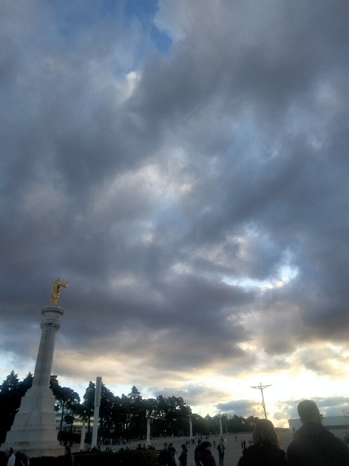 The image depicts an outdoor scene within the Sanctuary of Our Lady of Fátima, Portugal, specifically the Esplanade of the Sanctuary. The upper two-thirds of the frame are dominated by an overcast sky with dense, dark grey clouds interspersed with patches of lighter grey and a small area of blue sky in the upper left. A band of brighter, illuminated clouds is visible along the horizon, suggesting dawn or dusk. In the lower left quadrant, a tall, white stone column rises, topped with a golden statue, likely representing the Sacred Heart of Jesus. The figure faces right, with its right arm extended and hand pointing outwards. To the right, in the mid-ground, a large, dark-colored, modern crucifix is silhouetted against the brighter horizon. The ground level features a vast, open paved area, the Esplanade, populated by numerous small, indistinct figures of people scattered across the space, appearing to walk or stand. A line of dark green trees forms a boundary behind the Esplanade, partially obscuring distant white buildings and several tall, slender white columns. In the immediate lower right foreground, the backs of two individuals are partially visible, facing away from the camera and towards the scene.