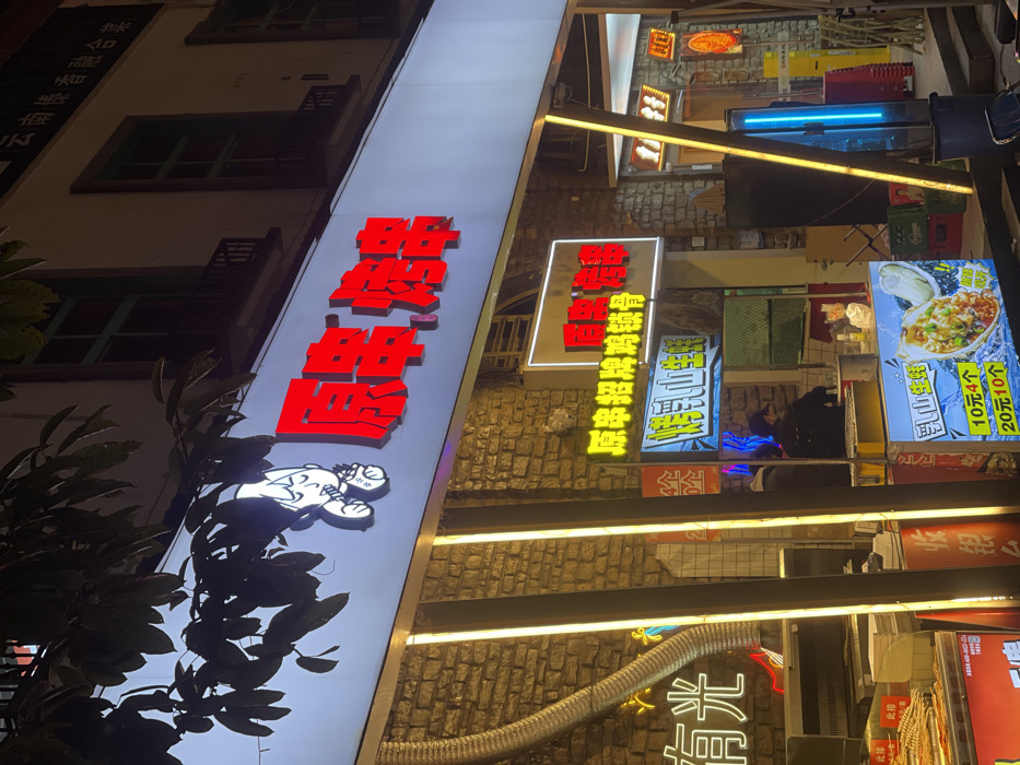 - "The image depicts a nighttime street scene in the Chongqing High-tech Zone, China, focusing on the brightly lit facade of a commercial establishment, likely a street food vendor or small restaurant" by FM-QQglM2, licensed under CC BY 4.0