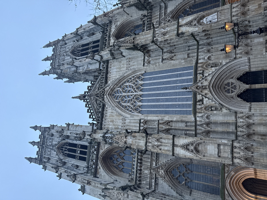 A high-angle shot captures the intricate architecture of York Minster. Twin towers rise against a pale sky, adorned with gothic spires and tracery. Stained-glass windows fill the vast openings, reflecting the overcast light. Ornate stone carvings and buttresses add depth and texture to the facade. Street lamps are seen to the right. The cathedral's imposing presence dominates the frame, showcasing its historical grandeur and architectural complexity.