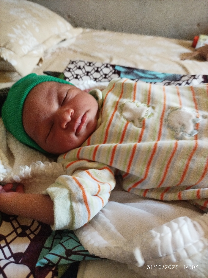 An infant is observed sleeping on a bed in the city of Pantame, Nigeria. The baby is lying on its back with eyes closed and mouth slightly agape, wearing a solid green beanie and a horizontally striped sleepsuit. The sleepsuit features off-white, orange, and light green stripes, with two white, cloud-shaped appliqués on the chest. The infant's right arm is slightly extended. The bedding consists of a light-colored textured blanket immediately beneath the baby, layered over patterned fabrics, including one with a white and dark geometric design and another with a teal and dark pattern. In the upper background, light beige pillows with a subtle floral pattern are visible. A timestamp of "31/10/2025 14:04" is present in the lower right corner.