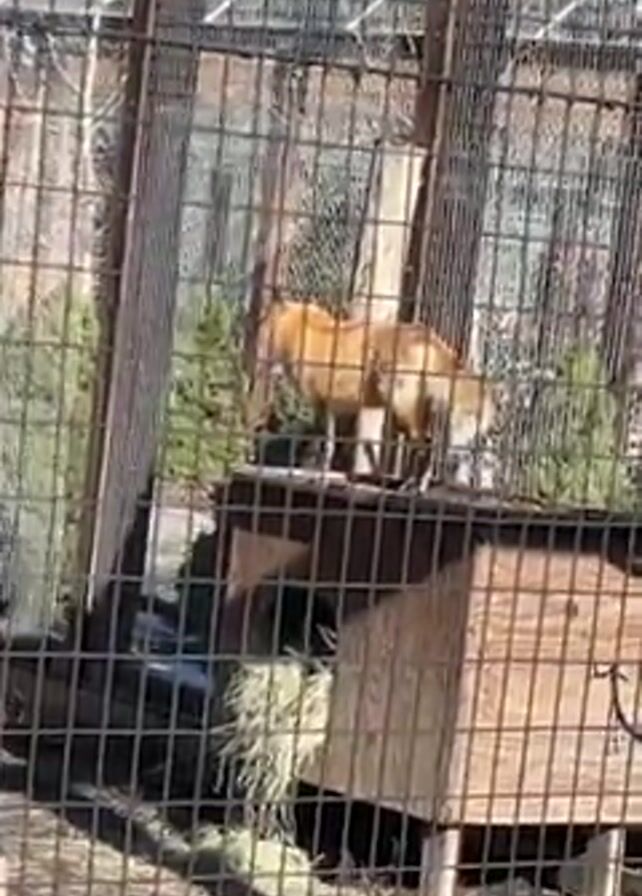 red fox in an enclosure made of chain-link fencing. The enclosure contains a small wooden structure with hay and two tree stumps with snow on them. The fox walks across the wooden structure and then down to the ground. The area outside the enclosure is wooded.