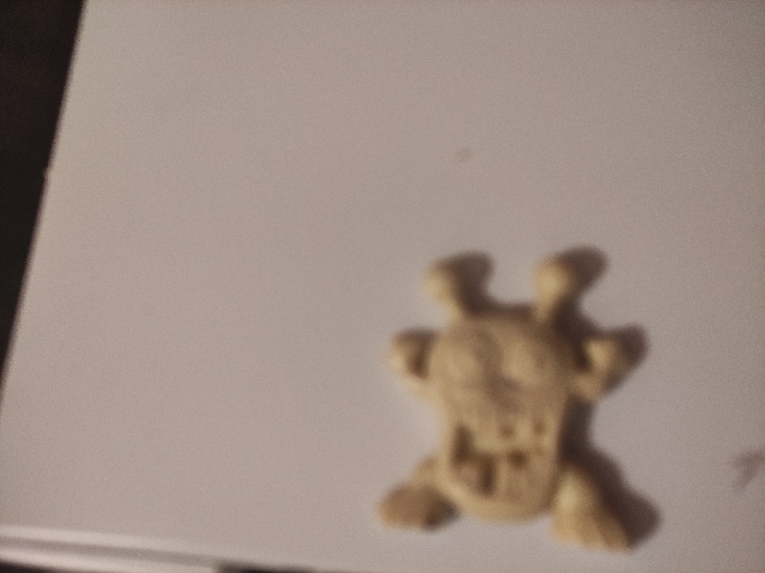 A blurred, beige-colored figure rests on a white surface. The figure has a vaguely humanoid shape with a rounded body, four limbs, and two protrusions at the top, resembling horns or ears. The body has crude facial features, possibly eyes and a mouth or teeth etched into it. The overall impression is that of a small, handmade figurine or cookie.