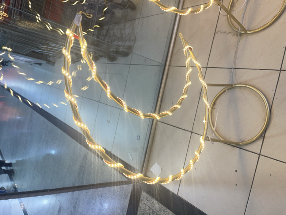A gold-colored, twisted-metal lighting fixture stands on a tiled floor. The fixture consists of two intertwined strands of metal with embedded lights, shaped like an elongated spiral. This spiral extends vertically, connecting to two circular metal bases, also gold-colored, resting on the floor. Reflections of shoppers and other objects are visible on a nearby glassy surface.