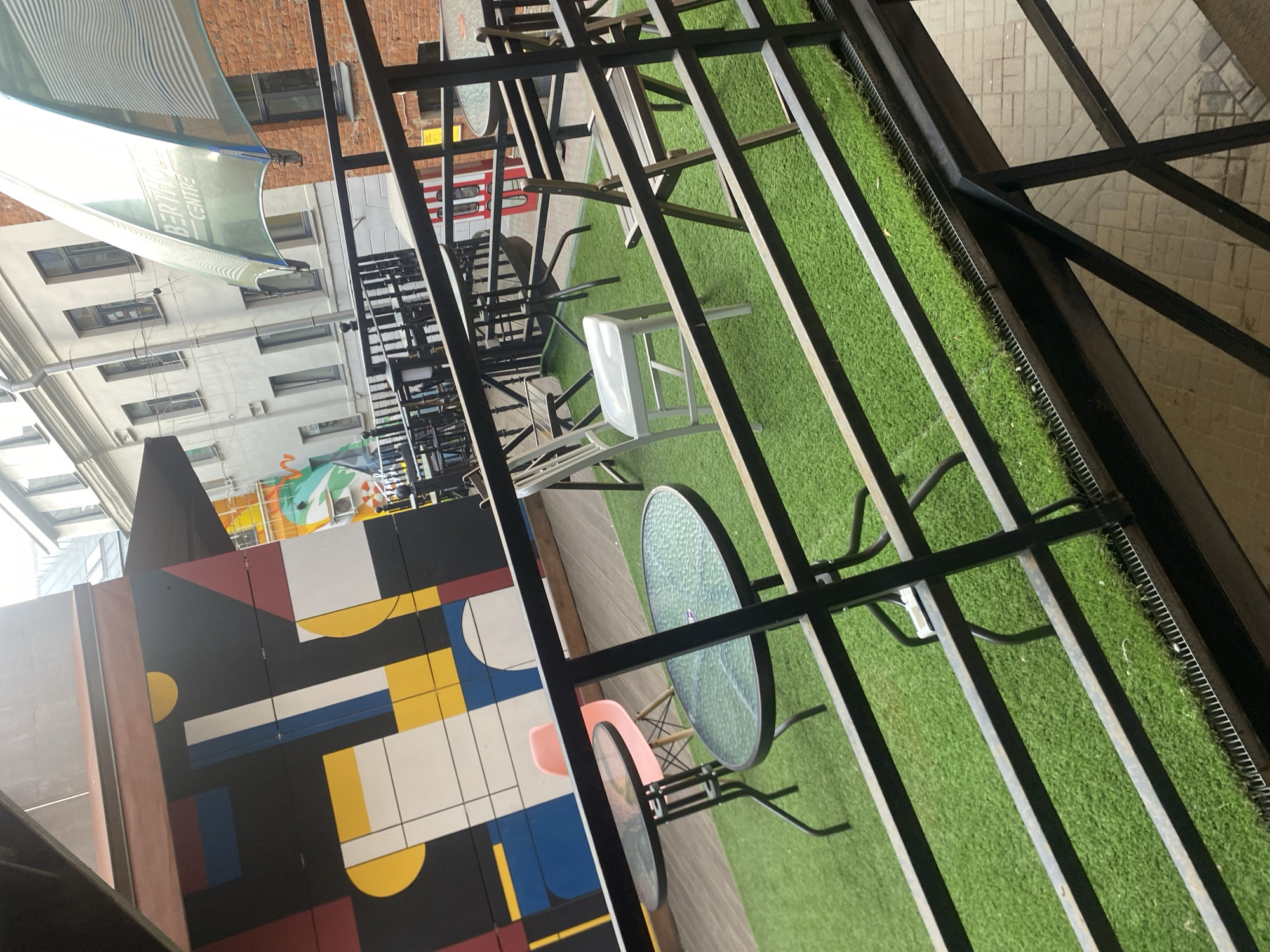 n outdoor seating area, possibly a cafe or restaurant, located in Saint Petersburg, Russia. The area features black metal framing, tables with chairs, and artificial green turf. A nearby building displays a colorful, geometric mural. A partial view of buildings across the street suggests an urban environment. A translucent awning with the word "BERTHOLD" is visible above.