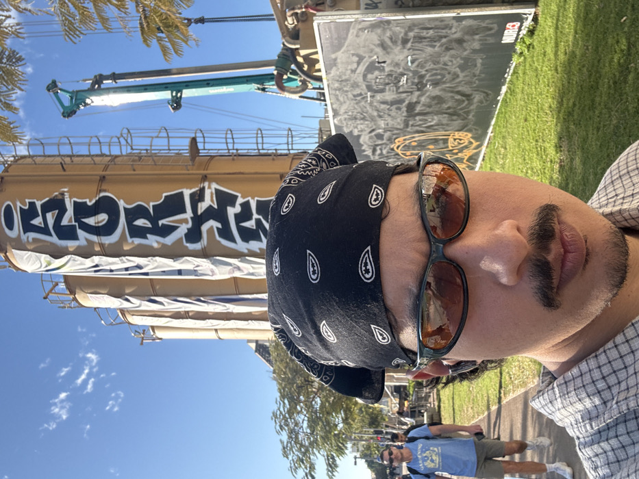 A male individual is depicted in a selfie, centered in the lower frame, wearing a black bandana with white paisley patterns, amber-lensed wrap-around sunglasses, and a light-colored plaid short-sleeved shirt