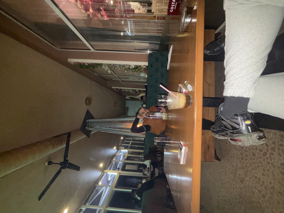 The image depicts the interior of a cafe or restaurant located in Sevlievo, Bulgaria. The perspective is from a seated individual, with their legs visible in the lower foreground; the left leg wears a black boot with a grey sole and black socks, while the right leg is clad in light grey sweatpants and a dark shoe is partially visible. A polished wooden table occupies the midground, featuring several items: to the left, an empty clear glass tumbler and a partially full pack of Marlboro cigarettes. Centrally, a glass contains a partially consumed light brown beverage with a pink straw. To the right, another partially full pack of Marlboro cigarettes, a white plastic lighter, a metal ashtray containing cigarette butts, and a red "COSTA COFFEE" branded basket are present. Seated behind the table, positioned to the right of center, is a male individual smiling directly at the camera. He is wearing an orange long-sleeved shirt with black sleeves and dark sunglasses on his head. His left arm is bent, hand behind his head, while his right hand holds a smartphone. To his right, a partially consumed clear beverage with a pink straw is on the table. He is seated on a dark green upholstered booth-style bench. In the background, to the left, additional patrons are visible seated at dark tables and chairs. The wall features large windows with white frames, revealing a dark exterior. The ceiling is beige, with a dark-bladed ceiling fan and a cylindrical ventilation duct running along it. A tall, pyramid-shaped outdoor heater is centrally located. To the right, a wall features decorative elements including light-colored flowers and what appears to be a white animal statue or figure (possibly a giraffe head) behind the seated man. More large windows with white frames are present on the right, decorated with hanging pink floral elements. The floor has a patterned, light brown tile surface. The lighting is dim, emanating from various ceiling fixtures and the heater.