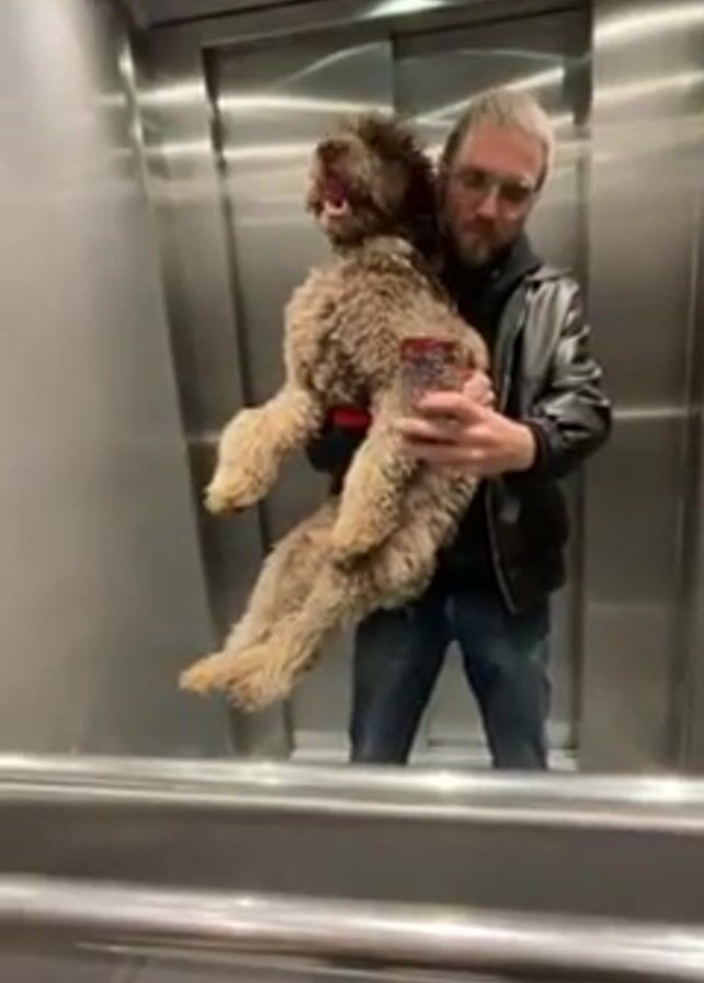 A man with blond hair in a bun and glasses stands in an elevator, holding a medium-sized brown poodle