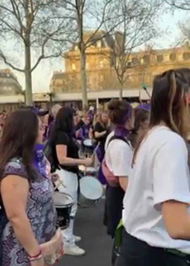 A medium shot depicts a crowd of women, mostly dressed in white and black, participating in an outdoor protest. Several women in the foreground are playing drums, while others appear to be chanting or singing. Many wear purple scarves or hair accessories, a possible symbol of the cause they are supporting. The scene is set on a street, lined with bare trees and classic European-style buildings in the background. The overall atmosphere suggests a rally or march, possibly related to women's rights or a similar social issue.