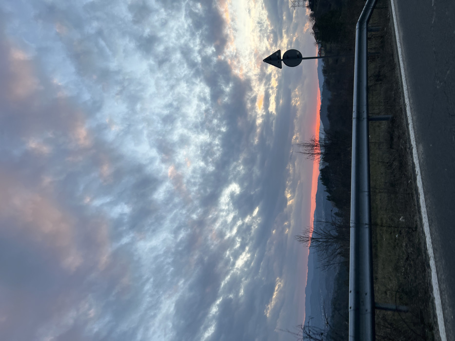 The image depicts a twilight scene in Svetulka, Bulgaria, observed from a roadside perspective. The sky occupies approximately two-thirds of the frame, dominated by a dense formation of grey and blue clouds, with patches of pale orange and pink light visible through breaks and along cloud edges, indicating sunset. A prominent band of intense orange-red light extends across the lower horizon, beneath the clouds, signifying the sun's position. Below the horizon, a hilly landscape is visible, covered primarily by dark vegetation, with some scattered buildings or lights in the distant valleys. In the mid-ground, a silver-colored metal guardrail runs horizontally across the lower third of the image, positioned above a grassy or dirt embankment featuring sparse, leafless trees and shrubs. To the right of the guardrail, a dark, triangular road sign, mounted above a circular sign on a single pole, is partially visible. Further to the right and slightly higher, a utility pole with power lines is discernible against the sky. The lower right foreground shows a section of asphalt road with a white demarcation line. No individuals or active subjects are present within the scene.