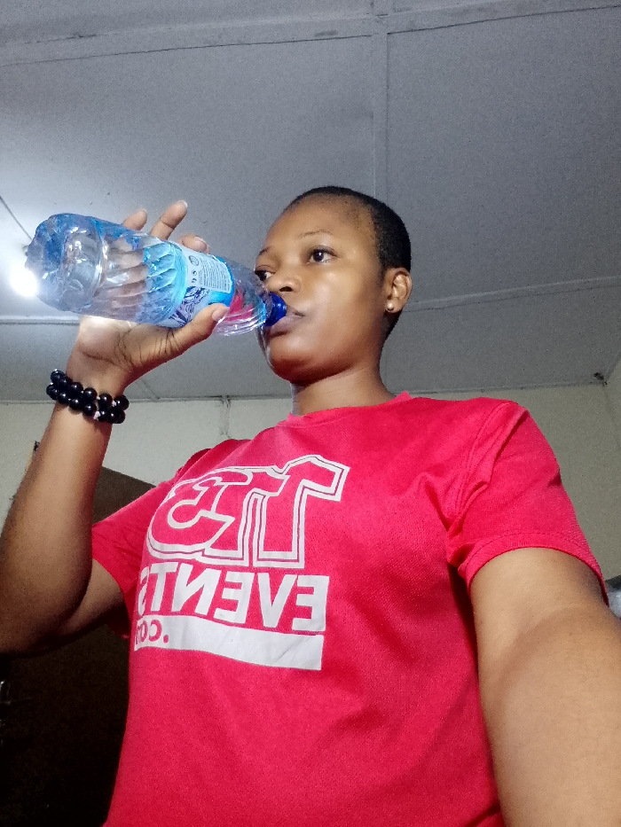 A young woman is drinking from a water bottle. She is wearing a red T-shirt with white lettering. The lettering appears to say "ST EVENTS CO.". She is wearing a black beaded bracelet on her left wrist. Her hair is short. The background is a dimly lit room.