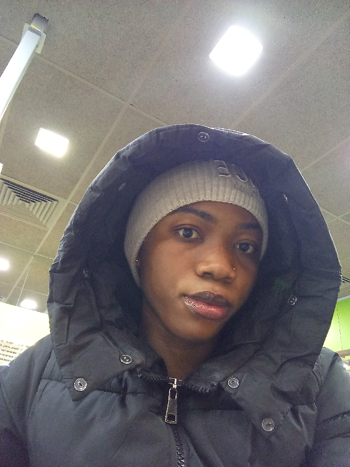 A young person poses for a selfie, wearing a dark winter coat with the hood up, and a grey beanie underneath. The beanie has the word "ICE" embroidered on it. The person has dark skin and appears to be in an indoor setting, with fluorescent ceiling lights visible. The coat is zipped, and the person's lips have a glossy sheen. A nose piercing is visible.