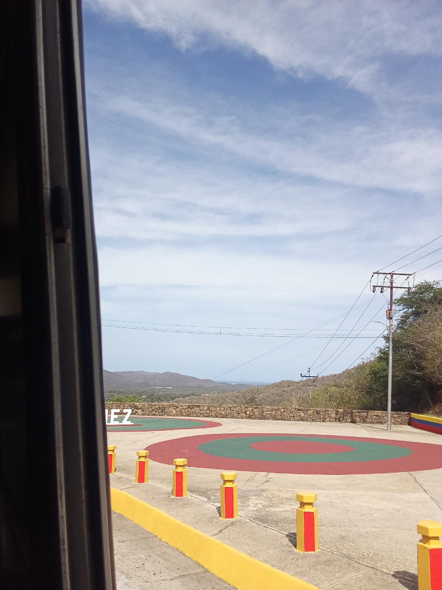 The image displays an outdoor scene captured through a dark, vertical frame, likely a vehicle's door or window frame, which occupies the left portion of the photograph. The scene depicts a public viewpoint or recreational area in Tacarigua, Venezuela. In the midground, a light-colored concrete surface is visible, featuring a yellow curb that extends horizontally from the lower left towards the center. Along this curb, several yellow and red painted bollards are uniformly spaced. Beyond the bollards, two large circular patterns are painted on the concrete, each consisting of concentric rings of red and green. Partially obscured by the bollards and the dark frame on the left, white block letters spell "EZ," likely part of a larger sign. To the right, another section of curb is painted in yellow, blue, and red, representing the colors of the Venezuelan flag. A low, stacked stone wall separates this paved area from a downward-sloping terrain covered with sparse, dry vegetation. The background features a range of hills or mountains covered in similar dry vegetation. The sky above is light blue with scattered cirrus clouds. Utility poles with multiple power lines extend across the landscape, with a prominent brown utility pole and electrical equipment visible on the right, partially obscured by a tree. In the far distance, a faint body of water or a valley can be observed, and a solitary industrial-style tower is barely discernible on the left horizon. No individuals or active interactions are present in the image. The scene is illuminated by natural daylight.