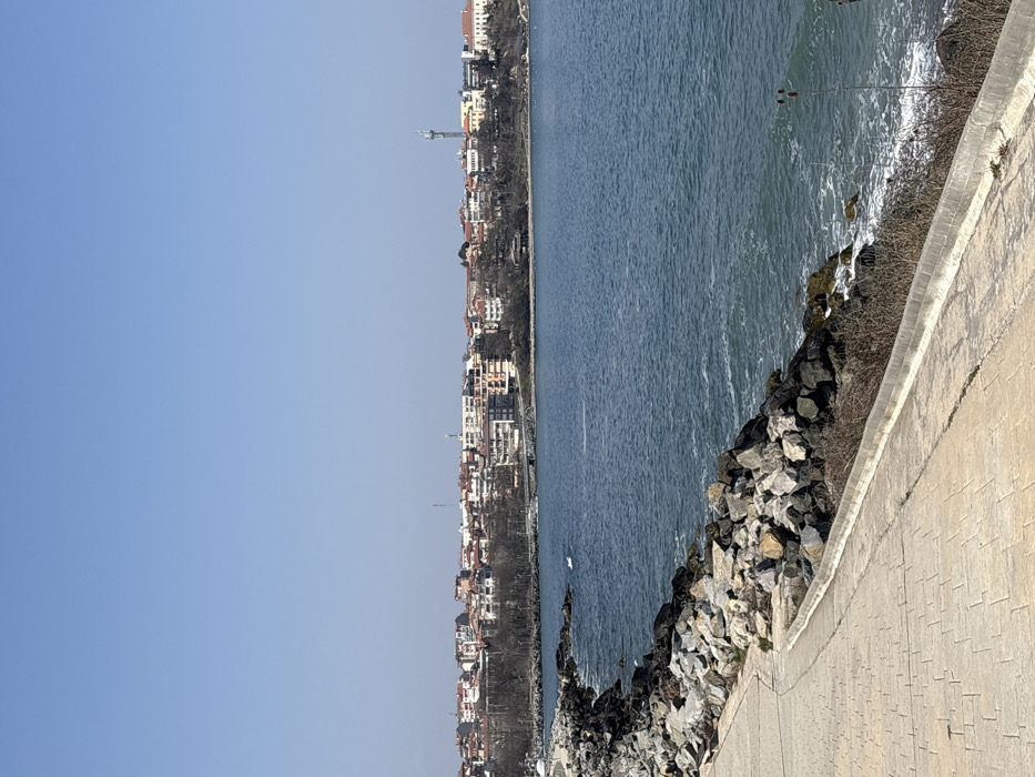 The scene presents a coastal urban landscape in Tsarevo, Bulgaria, under a clear blue sky. In the foreground, a light-colored paved promenade, constructed from interlocking pavers, curves gently from the lower left towards the mid-right. A low, grey concrete curb borders the promenade on its right side. Immediately adjacent to the curb is a rocky shoreline composed of large, irregular grey and black boulders, forming a breakwater. Sparse, dry, brownish vegetation grows among these rocks and along the base of the curb. The midground is dominated by a body of blue-green water, exhibiting minor wave activity with some visible white foam near the rocks. In the background, a town is situated on a gentle incline. This urban area consists of numerous multi-story buildings with varied architectural styles, many featuring red or orange-tiled roofs. Interspersed among the structures are deciduous trees, appearing bare. On the right side of the distant town, a tall, slender telecommunications tower is visible. Closer to the water in the mid-left background, a bridge-like structure crosses an inlet or narrow water channel. No individuals are present within the frame.