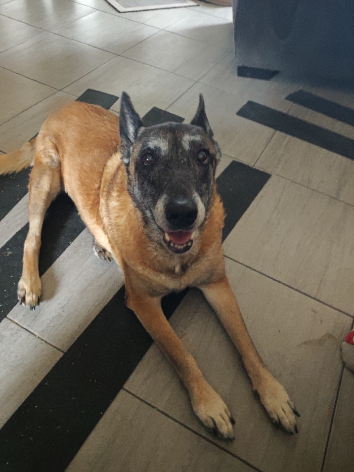 - "A mature Belgian Malinois with a grey muzzle lies on a patterned tile floor" by FM-JIUA53, licensed under CC BY 4.0