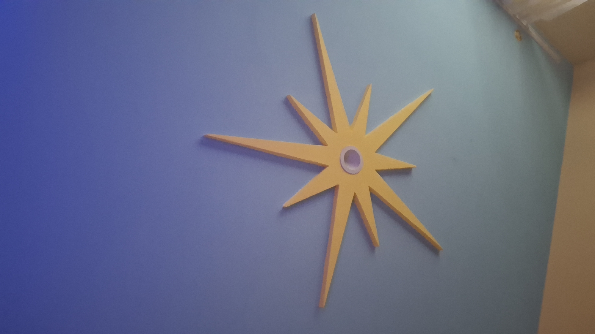 The image displays an indoor scene, specifically an upward view of a ceiling and upper wall section. A large, yellow, multi-pointed star-shaped decoration is centered on a light blue ceiling. The star features approximately eleven radiating points and a central circular opening with a white inner ring, likely designed for a light fixture. The light blue ceiling meets a light brown wall, visible in the lower quarter of the frame. In the bottom right corner, a portion of a light-colored window frame with a sheer curtain or blind is partially visible. No individuals, actions, or interactions are present. The location is in the city of Unknown, Unknown.