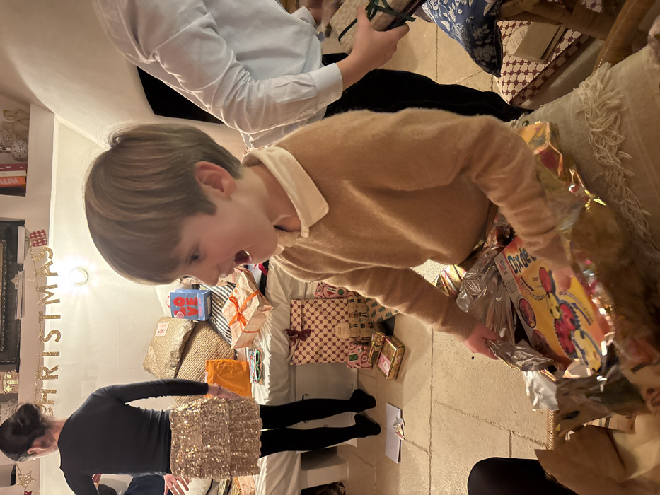 A boy in a tan sweater opens a silver-wrapped gift revealing a "Dixder" game. Christmas decorations adorn the wall. Gifts are scattered on a nearby surface. A woman in a black top and gold sequined skirt stands to the left. Another person in a white shirt and black pants is partially visible. The scene takes place indoors, possibly during a Christmas celebration.