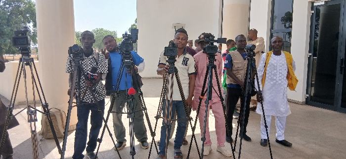 An outdoor scene in Unguwan Sanusi, Nigeria, depicts seven adult males positioned with professional video camera equipment, suggesting a media or filming event