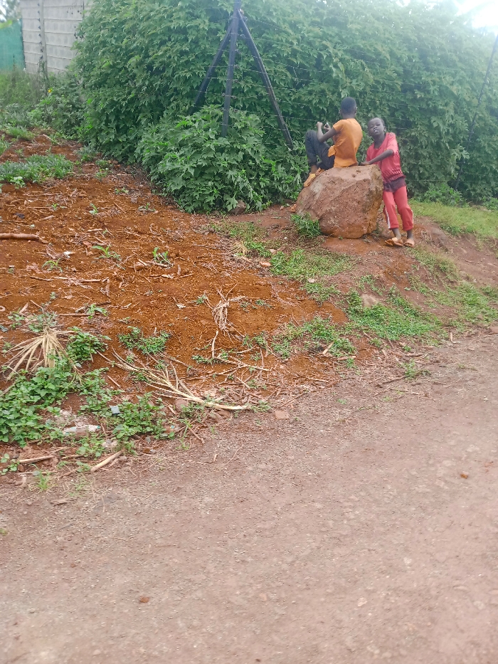 Two boys are positioned on and around a large rock on a grassy hillside. One boy, wearing an orange shirt and black pants, is sitting on the rock, while the other, in a red tracksuit, is standing beside it. A thick bush and a wire fence backdrop the scene. The ground slopes down to a dirt road in the foreground. The color palette is dominated by shades of green, brown, and red.