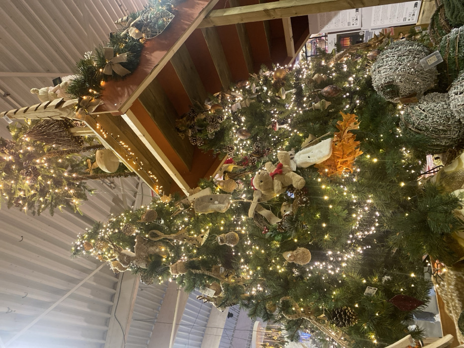 The image presents an interior view of a retail establishment in Mouscron, Belgium, centered on a large, artificial Christmas tree. The tree is extensively decorated with warm white string lights, fabric ornaments depicting reindeer, owls, squirrels, and a beige teddy bear wearing a red scarf. Additional adornments include pinecones, artificial mushrooms, wooden accents, and orange faux autumn leaves. To the right, a multi-tiered wooden display stand, lit with string lights and decorated with pine boughs and bows, supports a secondary decorated Christmas tree. The underside of this structure holds further pinecone wreaths. In the lower right foreground, two spherical, textured decorative objects, appearing as moss or tinsel-covered spheres, are displayed, one bearing a product tag. A partial view of a person's lower body (jeans and shoes) is visible in the distant left background, near other illuminated merchandise. The ceiling, constructed of white corrugated metal, suggests a large commercial space illuminated by overhead artificial lighting.