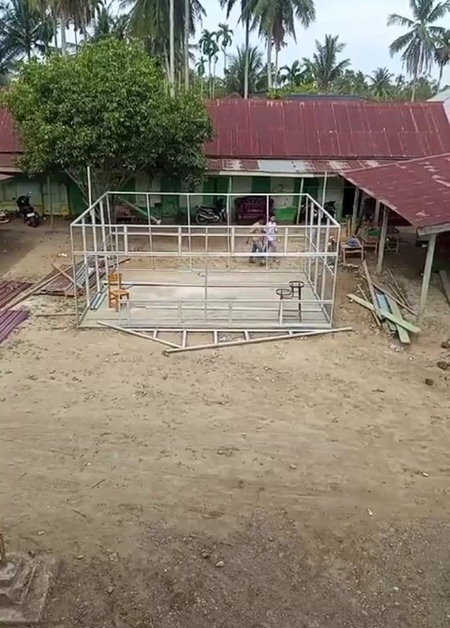 Here's a detailed description of the video: The video shows a construction site in what appears to be a tropical area. A metal frame structure is being built on a sandy lot. The frame is rectangular and seems to be the skeleton of a small building. A person wearing a white shirt and dark pants walks around the frame structure. The person appears to be observing or checking the progress of the construction. In the background, there are several houses with red roofs and green trim. Palm trees are abundant, surrounding the construction area. There are also pieces of wood and metal sheeting scattered around the construction site.