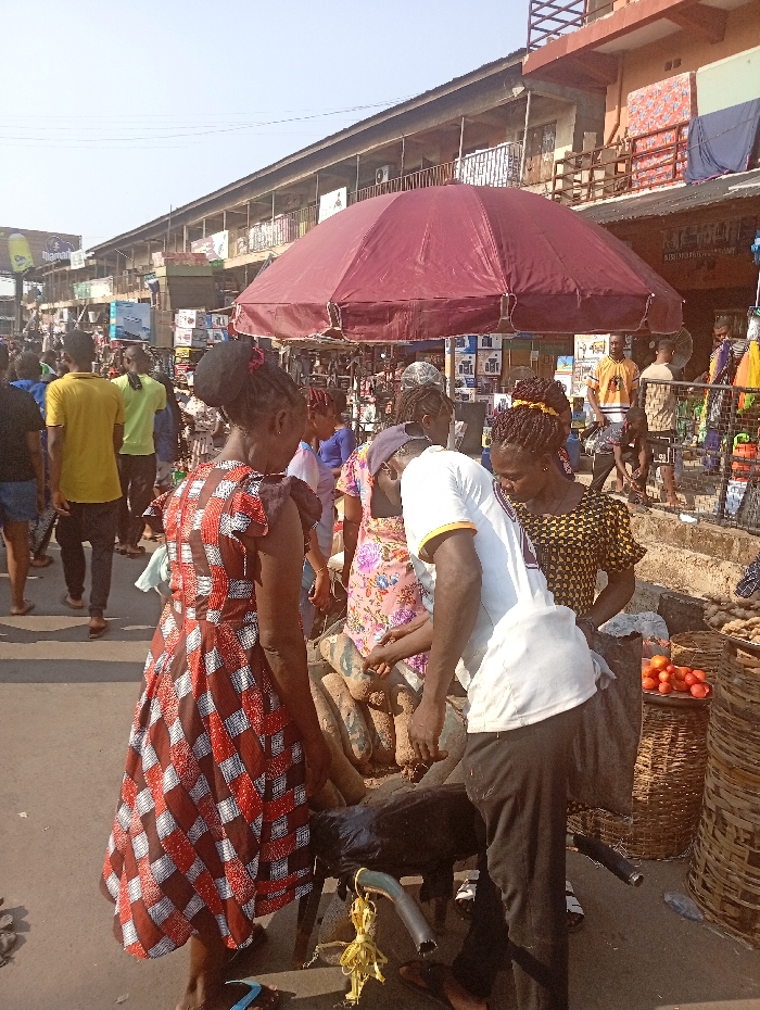- "A bustling market scene shows several people gathered around a vendor selling yams from a bicycle" by FM-wHrLz1, licensed under CC BY 4.0