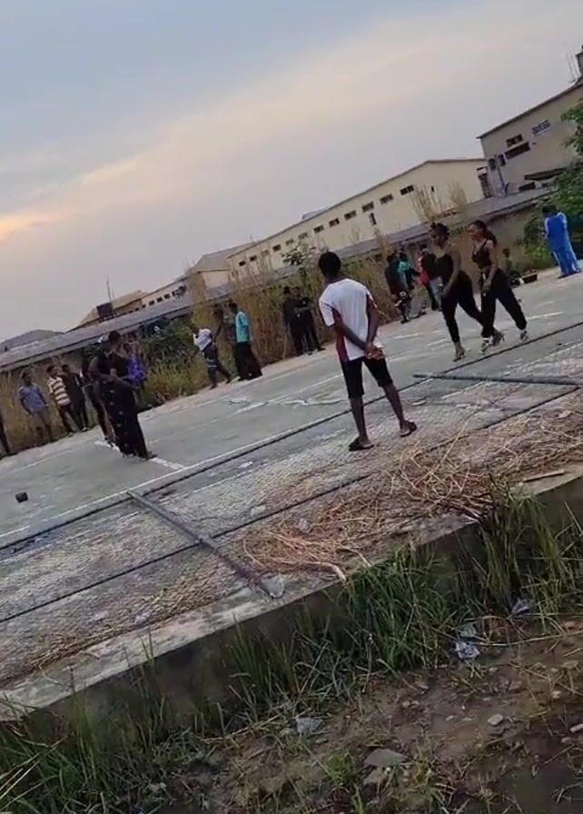 A group of about fifteen people, mostly young adults, are standing and walking on what appears to be a cracked cement sports court. They are observed in a casual outdoor setting, surrounded by grassy areas and buildings in the background. The weather looks overcast or it is late afternoon. Some individuals are wearing athletic apparel or casual wear, while others appear to be more formally dressed, possibly as part of a performance or event. There does not appear to be any specific activity taking place apart from the group's presence and movement within the court area. The camera is stationary and remains at a distance, capturing the general scene without focusing on any particular individual or action.
