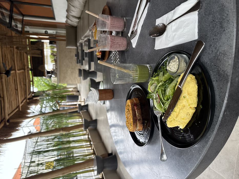 A high-angle shot reveals a gray, textured round table topped with breakfast dishes and empty glasses. An omelet with a side of salad and dressing sits on a black plate next to a sandwich on another plate. Empty glasses with straws litter the table, suggesting previous drinks. Silverware rests on a napkin. In the background is a partially visible outdoor patio with chairs, tables, and a tropical-themed structure.