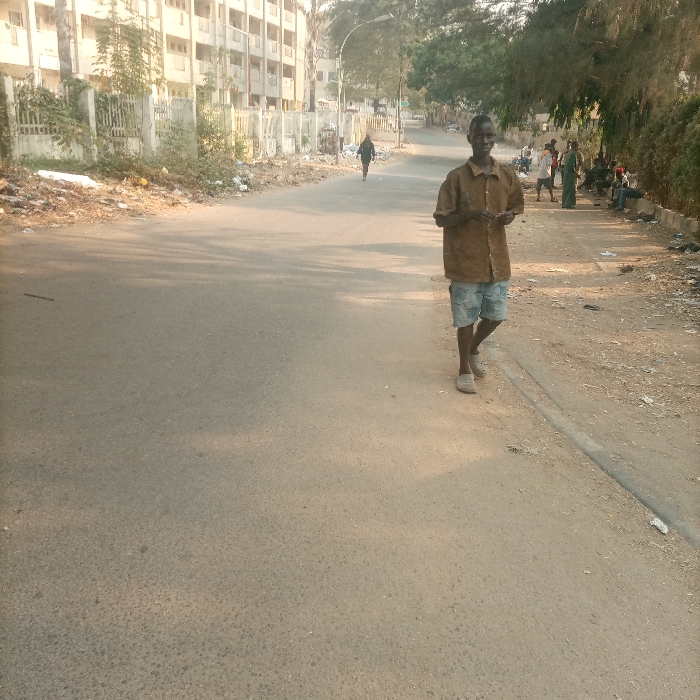 A man in a brown shirt and patterned shorts walks down a street on a sunny day. Trash lines the curb. Several people are sitting and standing under the trees in the background. Another person is walking down the road in the distance. A large building is visible on the left side of the road.