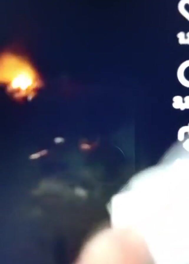 At night, a distant explosion is captured on video. The cameraman, in the foreground, is out of focus and partially obscured. The explosion, occurring on a field, produces a large, bright flash and sparks. A tree is vaguely visible in the background. An individual can be heard yelling. The footage appears to have been recorded on a phone, evident by the user interface on the right side of the screen.