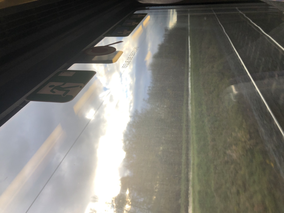 The image captures a view from inside a moving train near Dettwiller, France, looking outward through a window