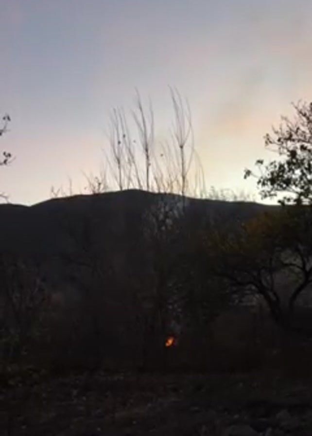 The video depicts a landscape setting, potentially a rural area, at what appears to be either sunrise or sunset given the lighting. The foreground consists of sparse vegetation and an uneven ground surface covered with dirt and rocks. A small fire is burning near the center of the frame. In the mid-ground, there are several trees and shrubs, some with bare branches while others have some foliage. In the background, there is a mountain range silhouetted against the sky. The lighting is somewhat muted and the colors are subdued, adding to the atmospheric quality of the video.