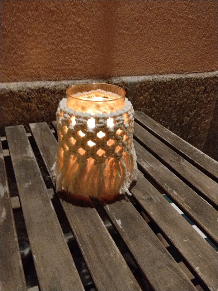 - "A single lit candle, contained within a clear glass votive and encased by a cream-colored macrame-style textile sleeve with a fringed lower edge, is centrally positioned on a weathered wooden slatted surface in Braga, Portugal" by FM-xkd7v1, licensed under CC BY 4.0