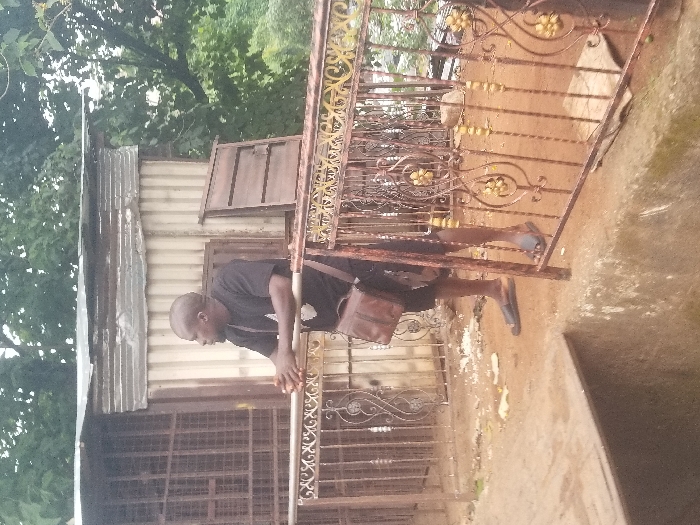 A male subject stands outdoors, leaning on a metal railing, within an environment consistent with an urban or semi-urban area of Onitsha, Nigeria