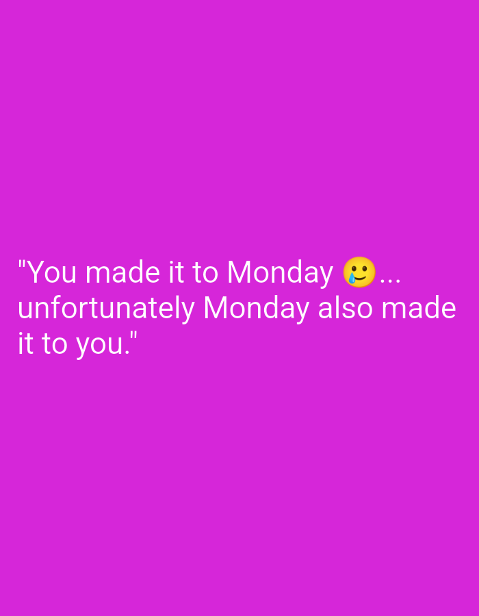 The image is a text-based graphic with the following content: "You made it to Monday 🥲... unfortunately Monday also made it to you." The background color is a vibrant shade of magenta. There are no other visual elements present.