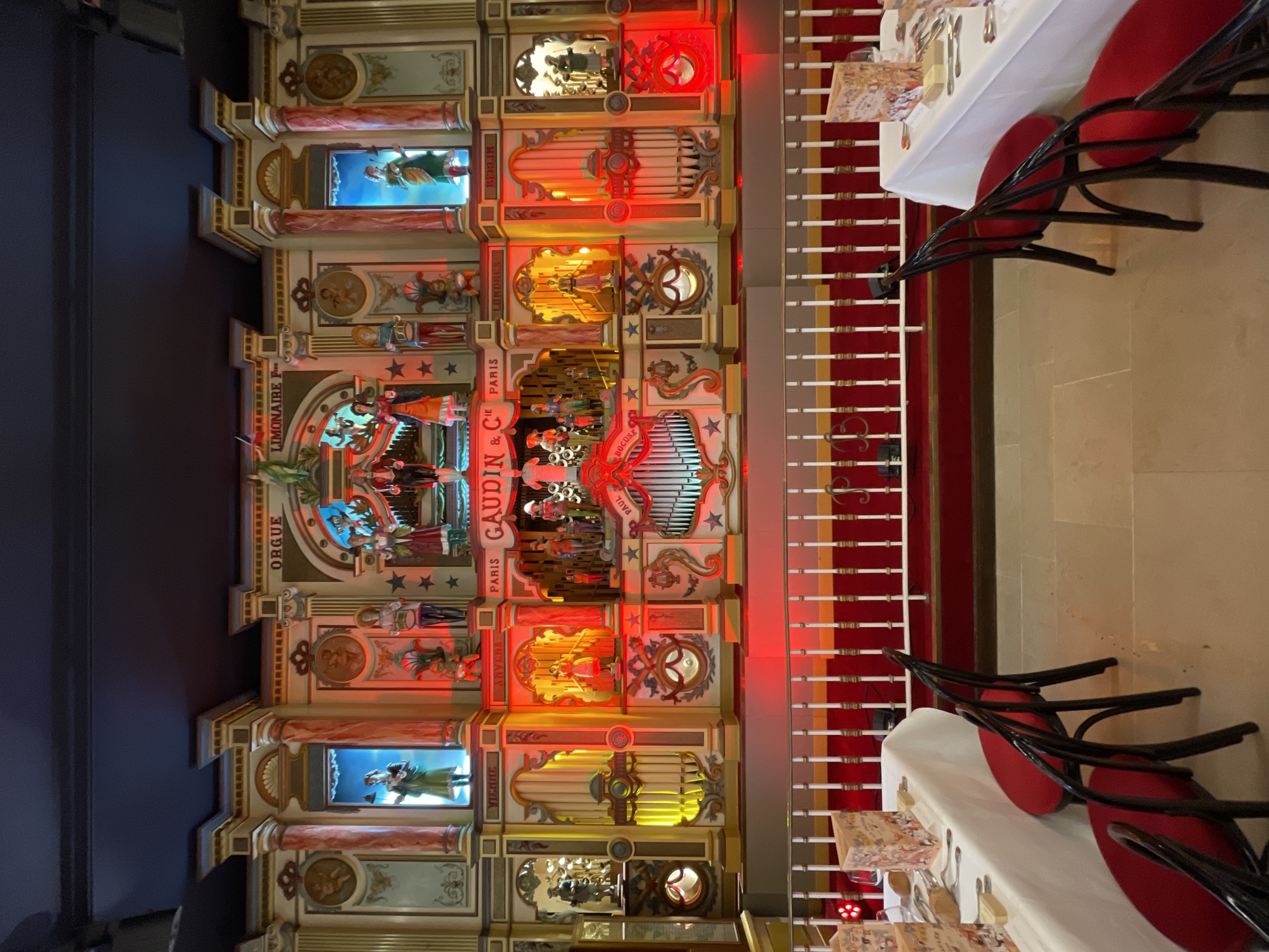interior of Paul Bocuse's Abbaye de Collonges restaurant in Collonges-au-Mont-d'Or, France. A large, ornate Gadaudin fairground organ dominates the scene. The organ is brightly lit and features animated figures and painted scenes. Tables set with white tablecloths, silverware, and printed menus are visible next to a red and white striped barrier. Red chairs are positioned around the tables. The background walls are a neutral color.
