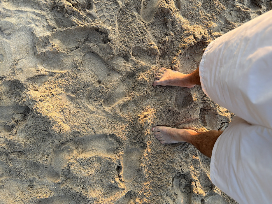 A first-person, downward-angle view captures the bare feet and lower legs of an individual standing on light brown sand