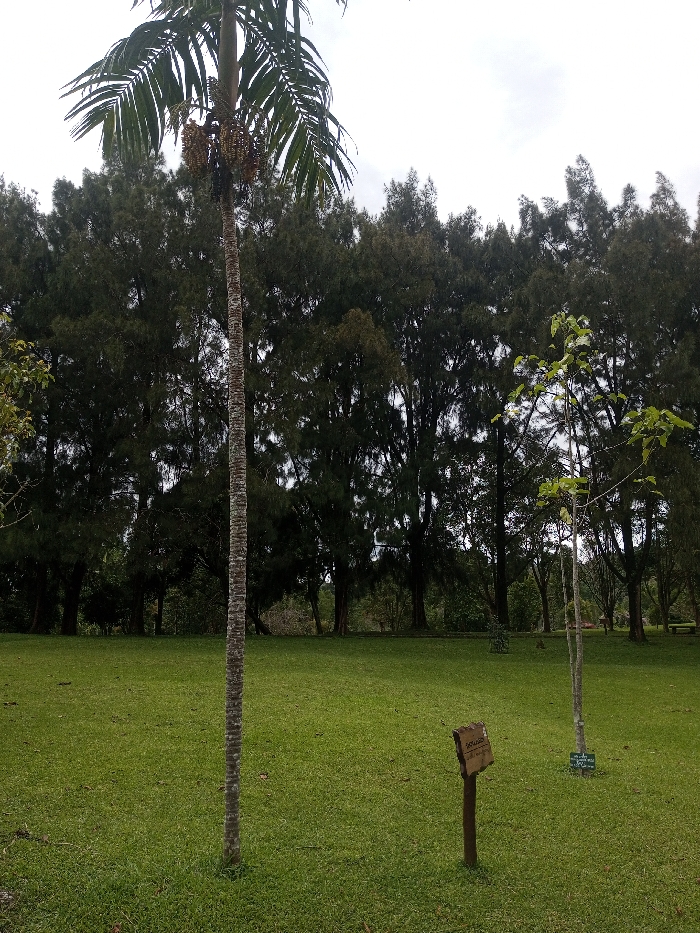A verdant lawn stretches out, dotted with a tall palm tree bearing fruit, a slender sapling, and a wooden signpost. A dense line of mature trees forms the backdrop, their dark foliage contrasting with the bright green grass. The sky is overcast, contributing to the subdued lighting of the scene. The setting evokes a tranquil park or botanical garden atmosphere.