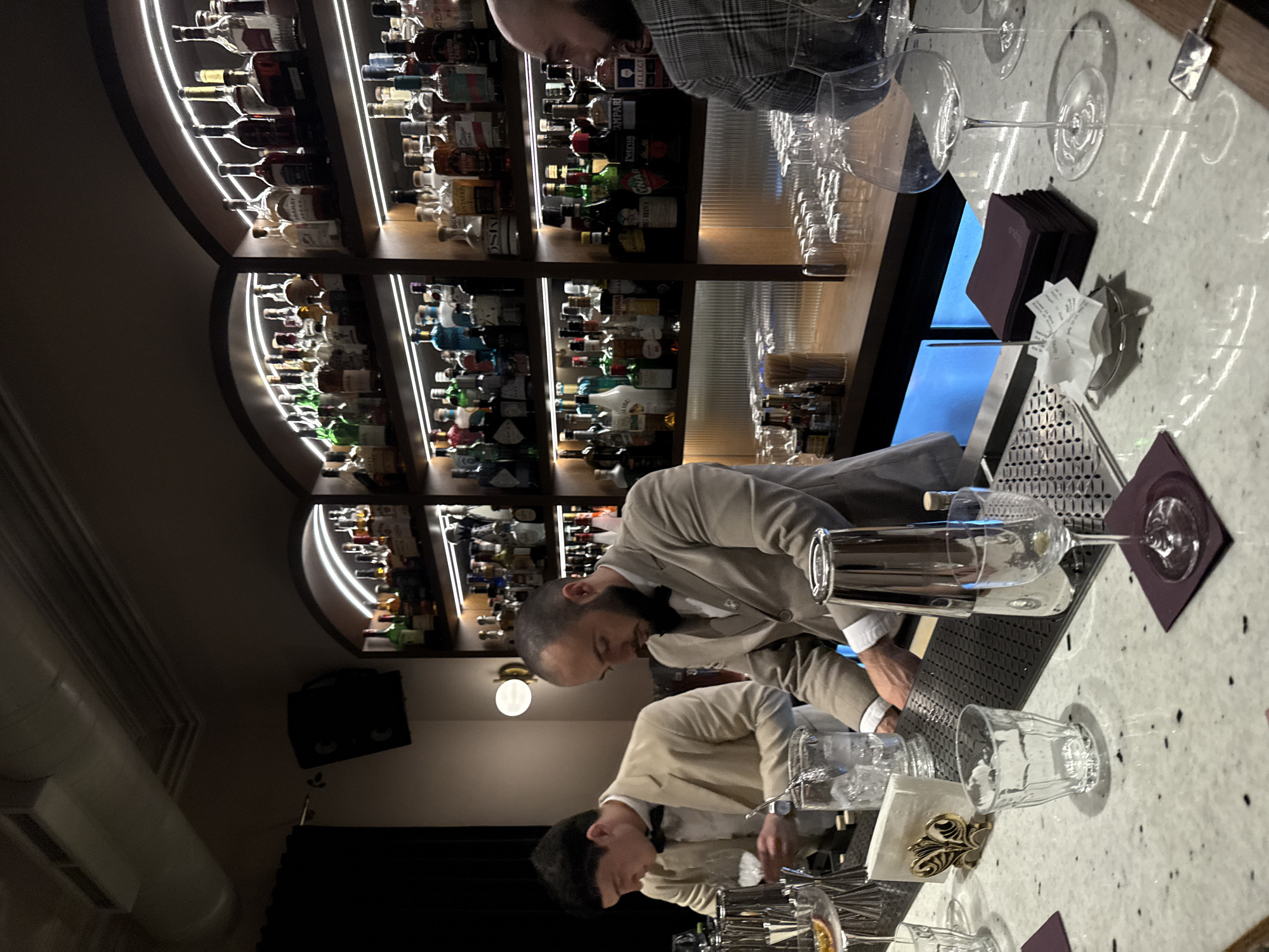 interior of a bar, likely in Yerevan, Armenia, featuring two bartenders working behind a counter. One bartender, dressed in a beige suit, stands at the counter, seemingly preparing drinks. Another individual is seen behind him, partially visible. The counter is equipped with glassware and other bar tools. In the background is a well-stocked liquor shelf. The setting is dimly lit, creating a cozy ambiance.