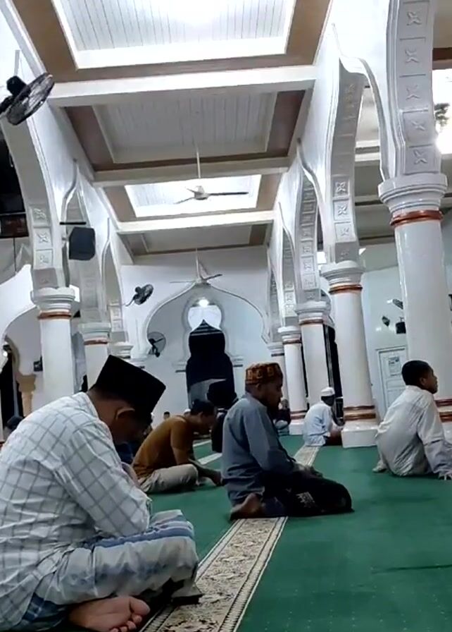group of men praying in a mosque. They are sitting on a green carpet with intricate patterns. The mosque has white pillars with decorative carvings and a white ceiling with square skylights. Ceiling fans are visible. The men are wearing traditional Muslim clothing, including head coverings. They are focused on their prayers, with some bowing their heads. The atmosphere is serene and peaceful.