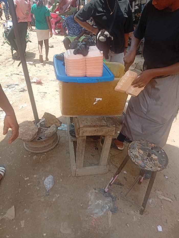This image depicts an outdoor vendor stall in a bustling, unpaved street or market area in Fegge, Nigeria, under bright daylight. In the foreground and mid-ground, a vendor is operating a makeshift stall. A large, amber-colored plastic cooler, likely insulated, rests on a rustic wooden stand. On top of the cooler's blue plastic lid, two tall stacks of light-pink, rectangular plastic takeout containers with matching lids are neatly arranged. A dark plastic bag is also on the blue lid. To the right of the stacked containers, a yellow plastic vessel is partially visible. A person, presumably the vendor, stands to the right of the stall, facing inward. They wear a dark short-sleeved top and a light grey skirt or wrapper. Their right hand holds two of the light-pink takeout containers. Behind the stall, another individual wears a black short-sleeved top, light-colored trousers, and a black cross-body bag with a small brown plush toy attached. The ground is unpaved, consisting of dry, light-brown soil, scattered with small pieces of litter and debris. In the lower left foreground, a segment of a person's foot wearing a white-striped sandal is visible. A dark metal pole extends upwards from the lower left. Adjacent to its base is a discarded metal wheel rim, containing several irregular-shaped rocks. To the right, a three-legged metal stool with a round, flattened metal object as its seat stands on the dirt ground. In the background, multiple indistinct figures are visible, some walking away. One person wears a pink top, another a green top and light skirt. Further back, a person in a blue patterned shirt is seated or squatting. Various market goods or structures, including brightly colored items, are present in the distant background, consistent with a busy market environment.
