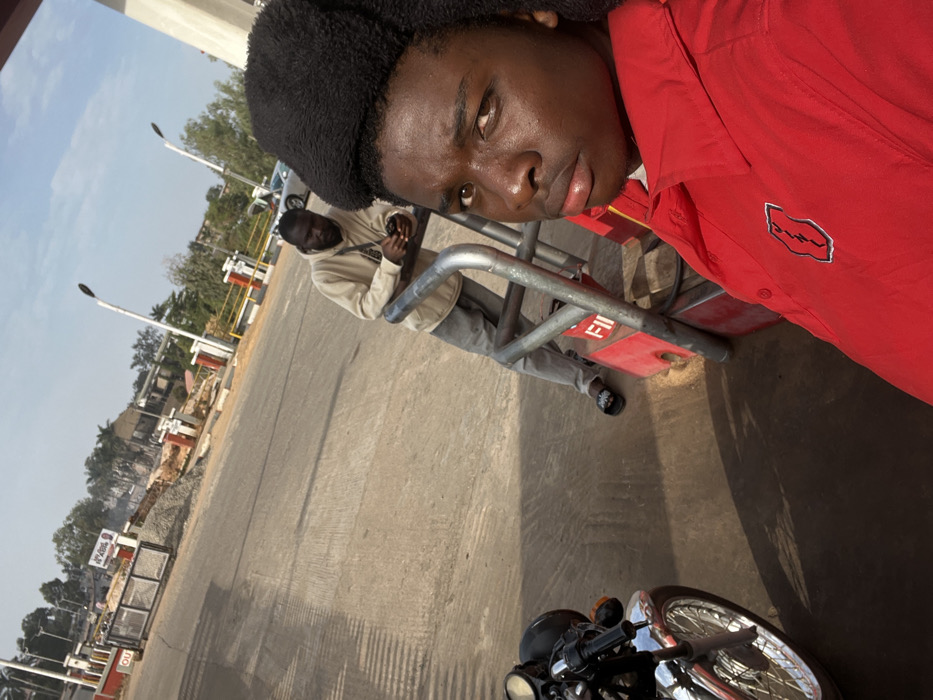 A young man with dark skin and curly hair wears a red collared shirt with a logo and poses for a selfie. Behind him is another man in a light-colored hoodie and grey pants. They stand near a grey metal structure, possibly a barrier, marked with red and white. Below them, part of a motorcycle is visible. The background shows a street with lampposts, buildings, and some construction work. The overall lighting suggests a sunny day.