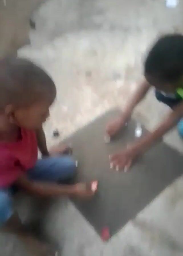 Two young children are sitting on a concrete floor, playing a game on a small, dark-colored square board. The child on the right is wearing a neon green shirt, patterned pajama pants, and blue slip-on shoes. The child on the left is wearing a red t-shirt and blue shorts. Both children are barefoot. They are arranging small, white and black discs on the board, each taking turns. A red bottle cap is visible on one corner of the board. The background includes a white bag, a broom, and other indistinct items. The lighting is somewhat dim, casting shadows on the floor.