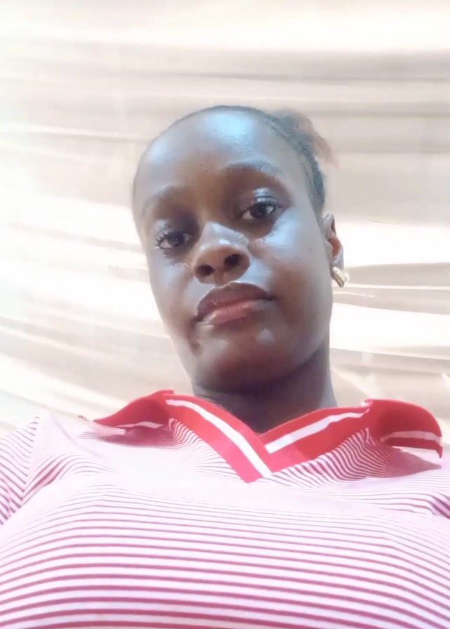 A woman is looking down into a camera lens. She is wearing a pink and white striped shirt with a red trim. Her hair is pulled back. She is indoors. The background is a plain white fabric.