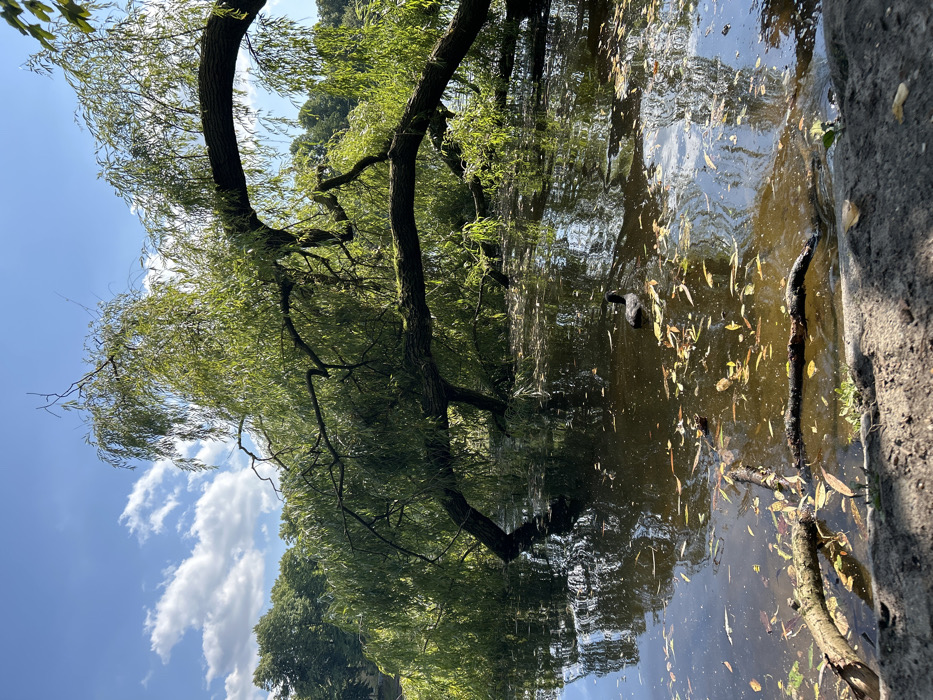 - "A large weeping willow tree is depicted with its main trunk extending horizontally over a body of water, with numerous green, leafy branches drooping down and partially submerged" by FM-6Voen1, licensed under CC BY 4.0