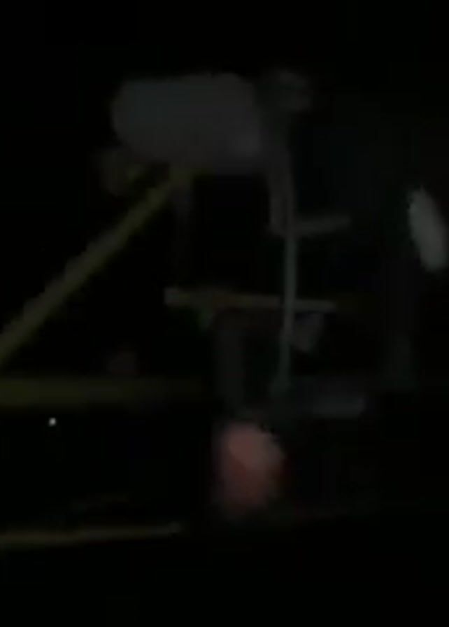 In the dark, a person manipulates a yellow-framed net or stretcher with white material inside. They appear to be lifting or maneuvering the item. The scene is dimly lit, making details hard to discern.