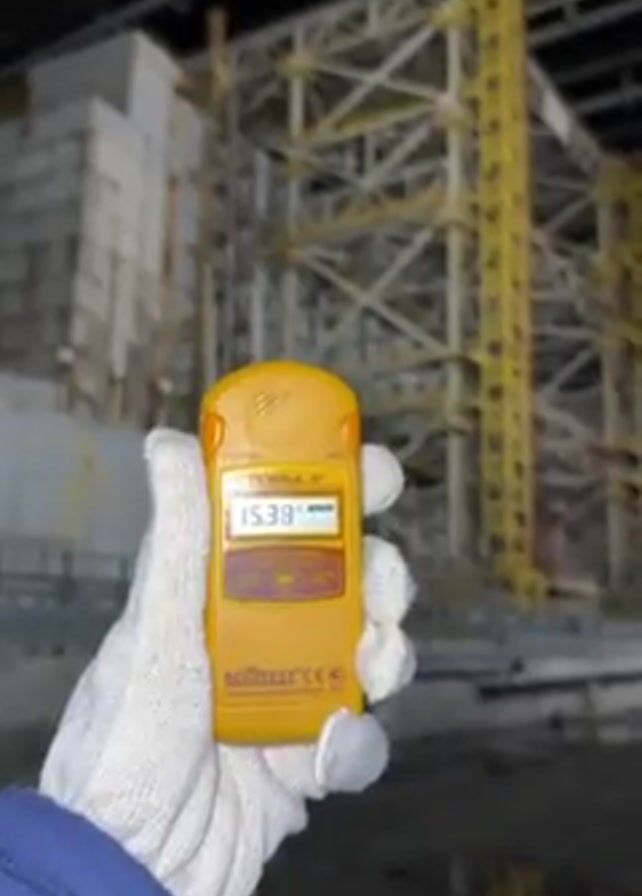 person wearing a white glove and a blue jacket holding a yellow TERRA-P radiation dosimeter, which displays a reading of 15.38. The device beeps, indicating radiation. The camera then focuses on a large, complex structure composed of white blocks and a steel framework painted yellow and white, illuminated in an otherwise dark environment. The structure appears to be a significant construction, possibly industrial, with visible signs of wear and age.