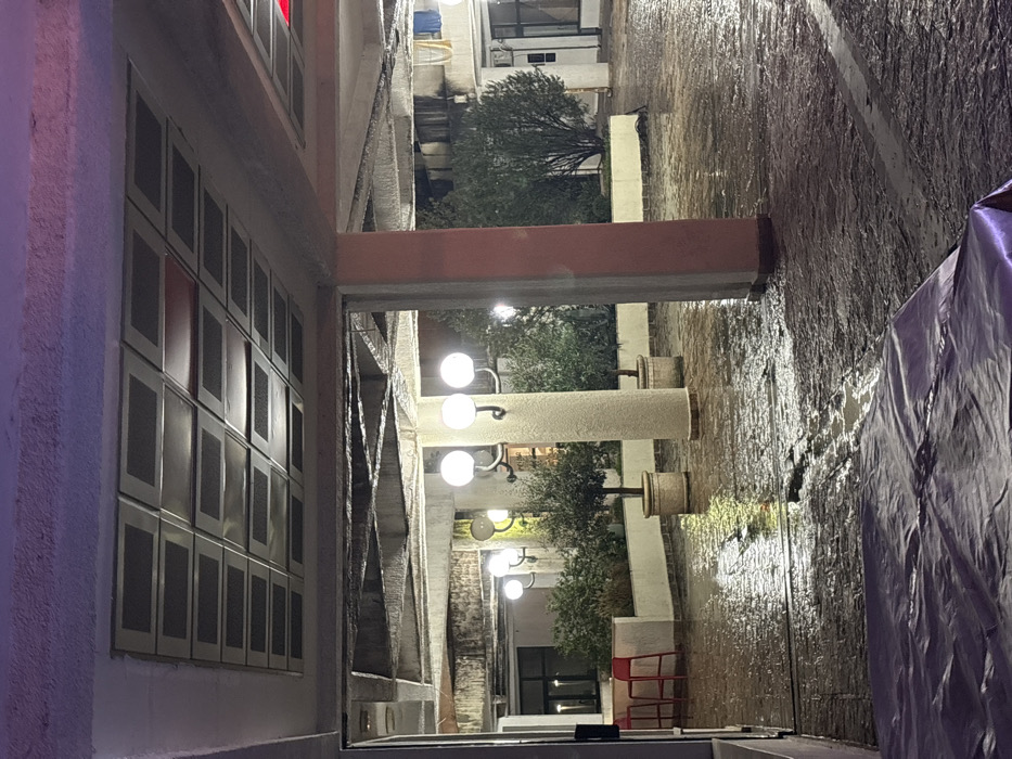 The photo shows a dimly lit street at night, likely during or after rainfall. A building with a grid of rectangular windows is on the left. Overhead streetlights line the center, illuminating the wet pavement. On the right, a partially visible structure is covered with a large, draped material. Trees and other buildings are seen in the distance. The scene is captured from a low angle, looking upwards.